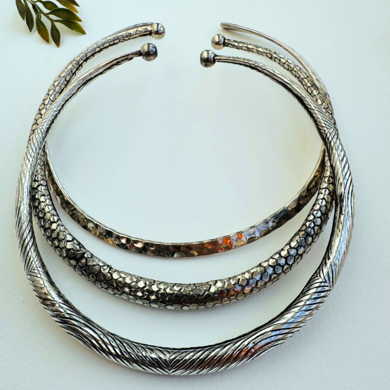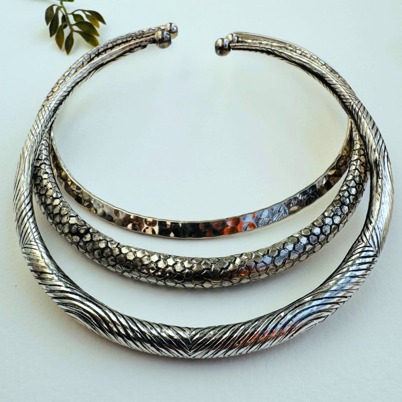 Boho Etched Silver Toned Brass Choker Set – Intricately Carved Designs (Set of 3)
