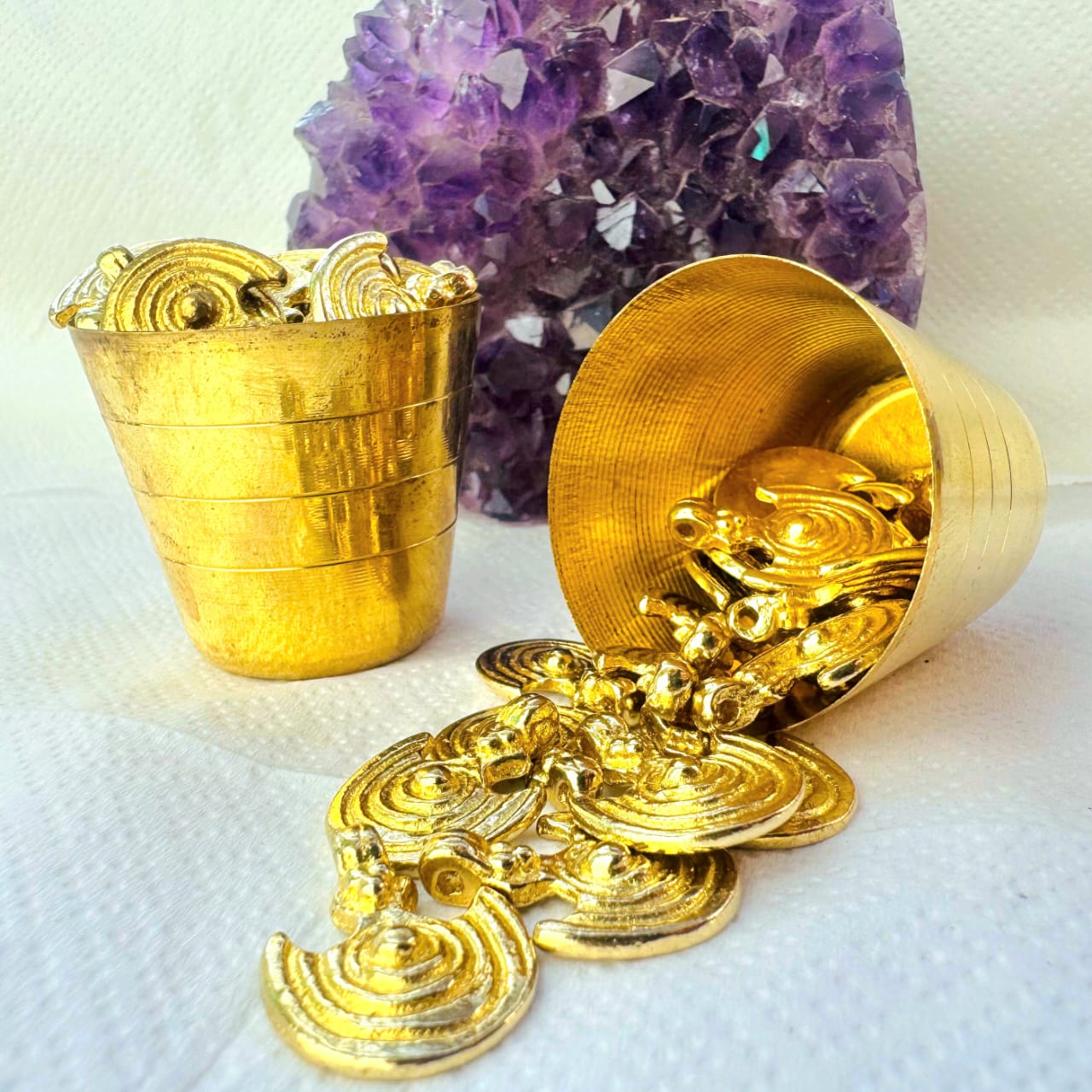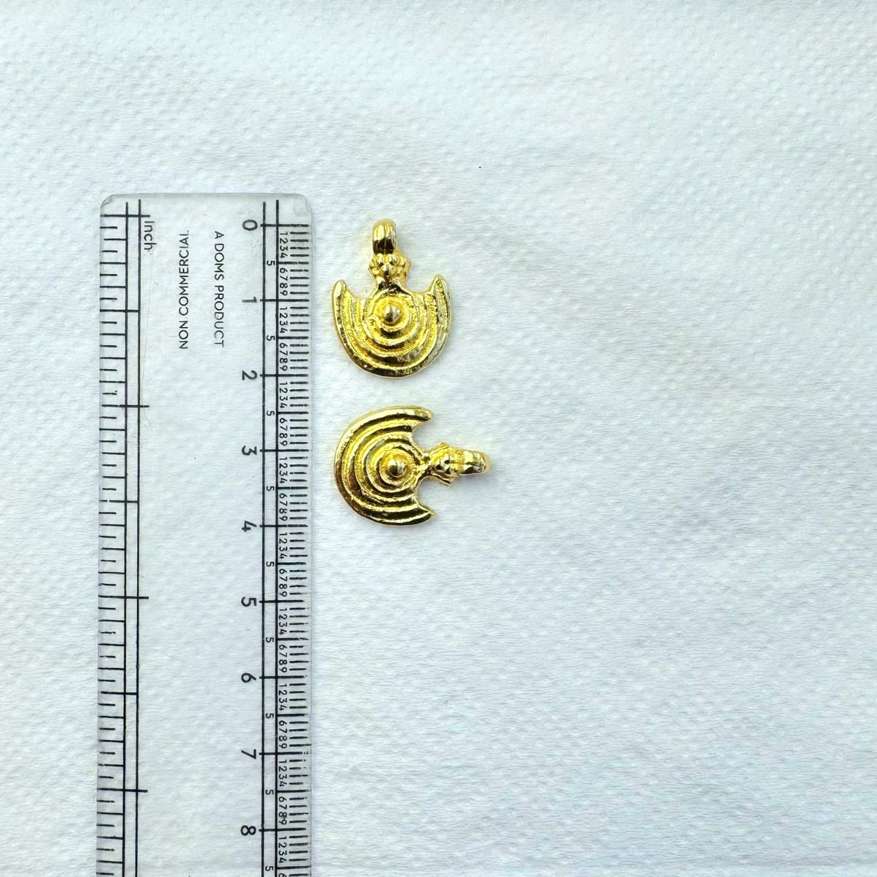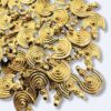 These ethnic inspired brass charms feature a crescent form decorated with concentric spiral lines, creating a strong tribal and symbolic look. Finished in a warm gold tone, they add depth, texture, and meaning to handmade jewelry designs.