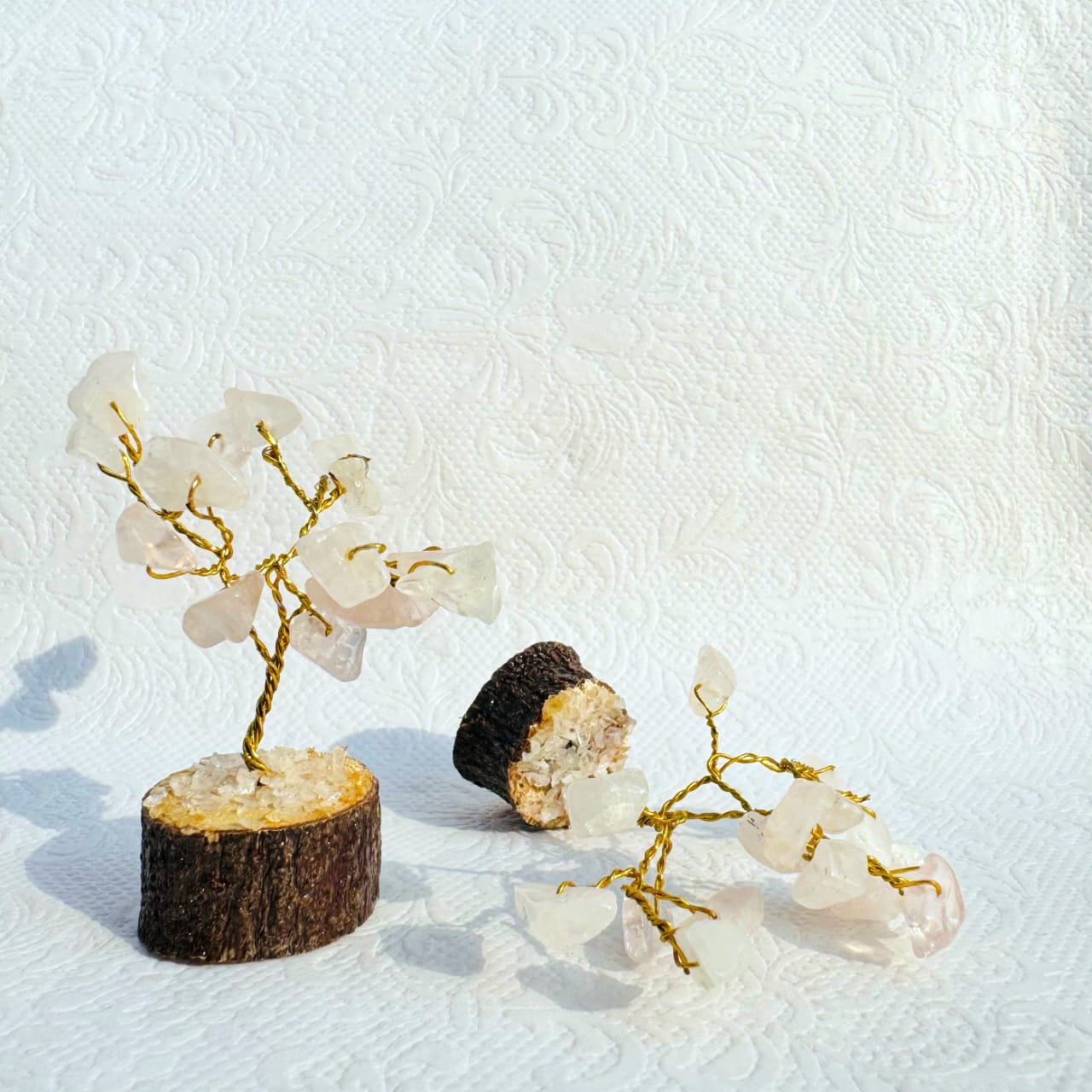 This handmade gemstone bonsai tree combines natural crystal stone chips, chosen for their soft green and creamy tones that evoke freshness and harmony. Each stone is carefully wrapped and shaped by hand onto warm brass wire branches, forming an organic, tree-like silhouette inspired by nature.