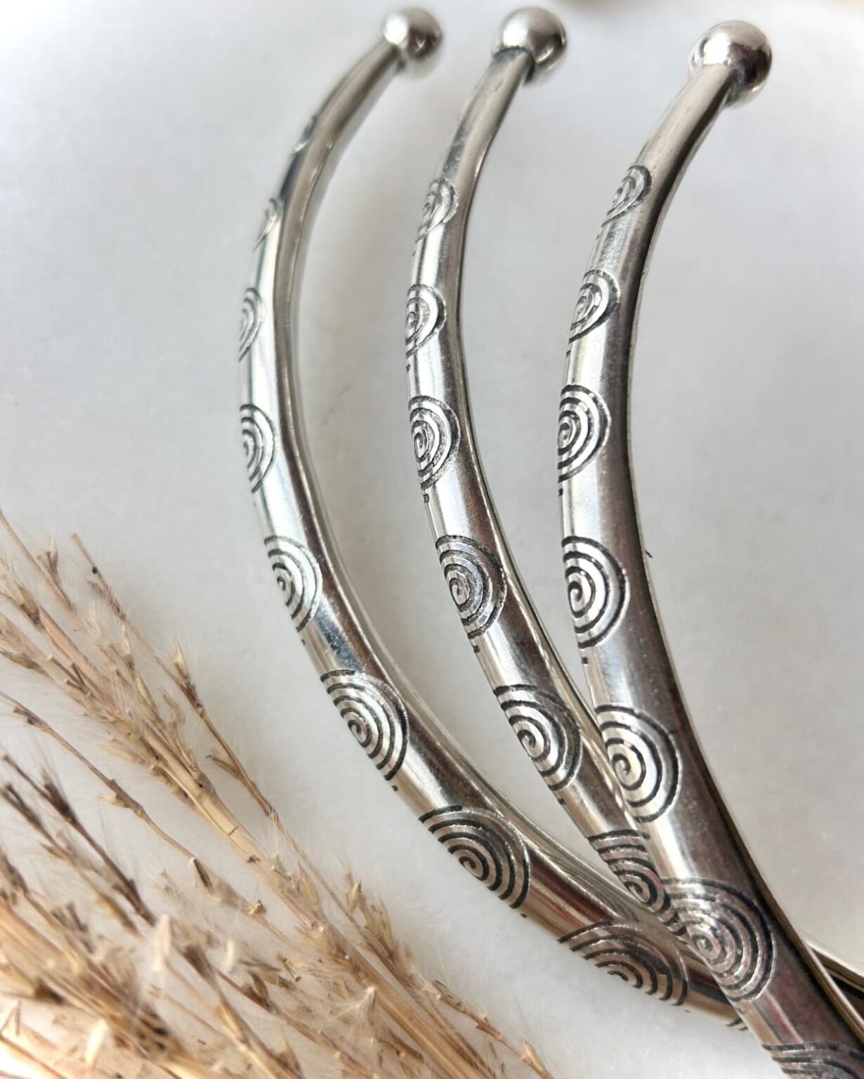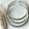 Its smooth, rounded brass form is finished in a luminous silver tone and detailed with engraved arc patterns that flow continuously around the choker, creating a sense of movement and harmony. The open back design allows for a comfortable, adjustable fit, while the polished surface catches light subtly without overpowering the look. The engraved arcs add depth and texture, making this choker feel intentional and sculptural rather than decorative.