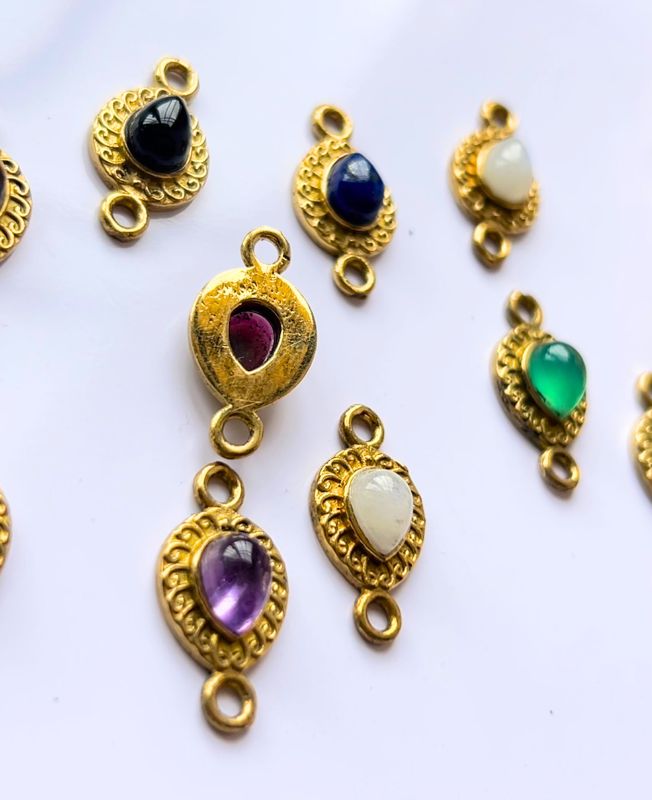 This stunning teardrop gemstone connector features a vibrant natural stone embedded in a gold-tone ornate frame inspired by vintage leaf motifs. With connecting loops on both ends, this charm is ideal for creating bracelets, necklaces, or earrings that need a pop of color and texture.