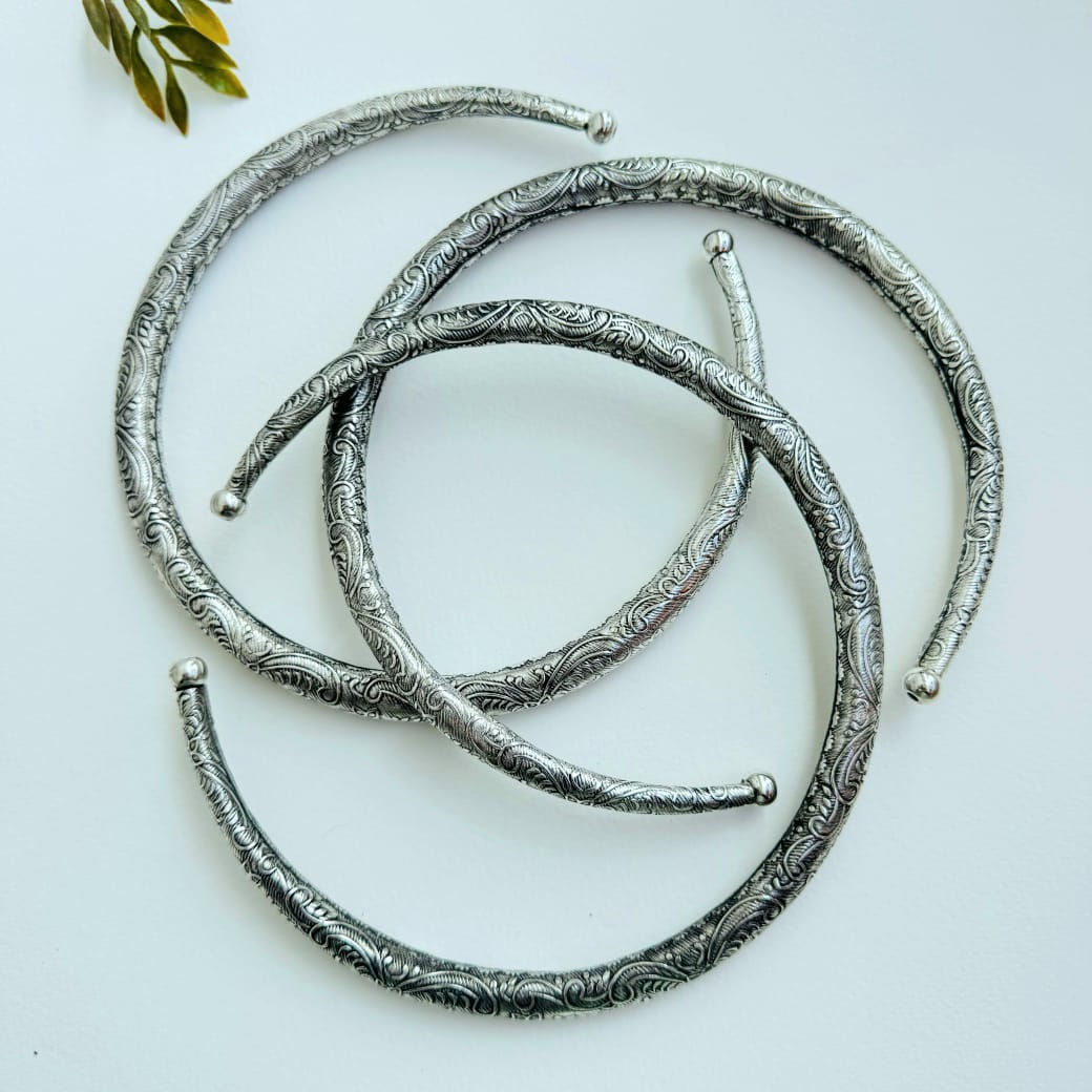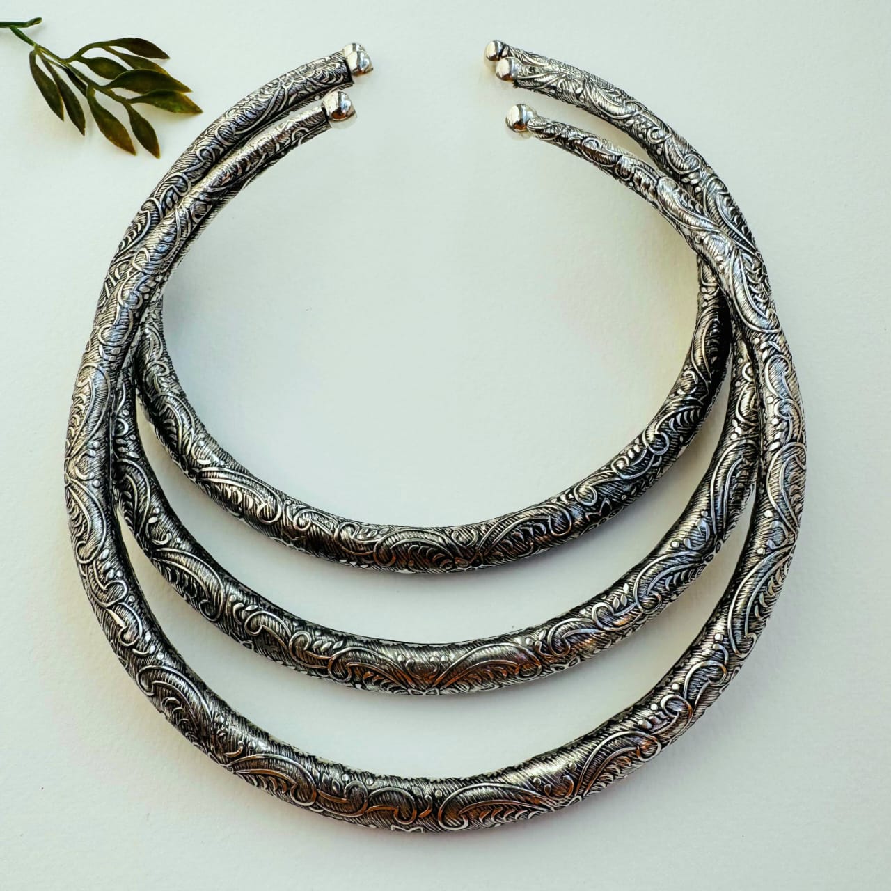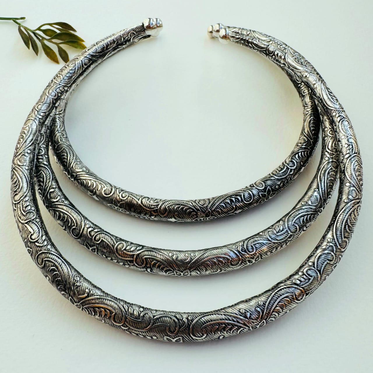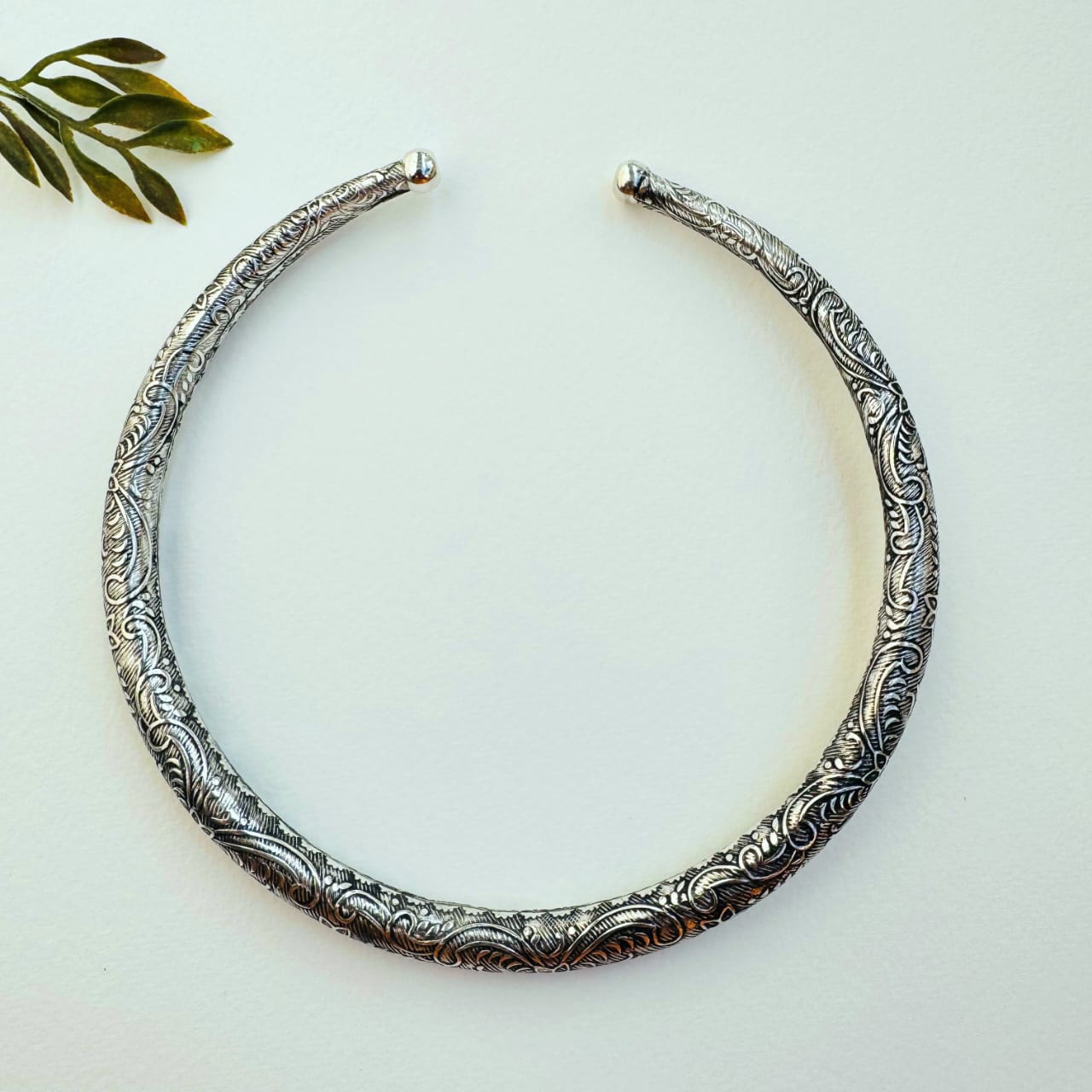 These engraved silver toned brass chokers are striking statement necklaces inspired by traditional and tribal metalwork. Crafted from solid brass and finished with an oxidized silver tone, each choker features rich, flowing engraved patterns that add depth, texture, and character.