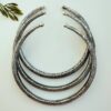 Bold silver toned brass chokers with detailed engraved patterns. Strong yet elegant statement pieces, perfect worn alone or layered for a dramatic neck adornment.