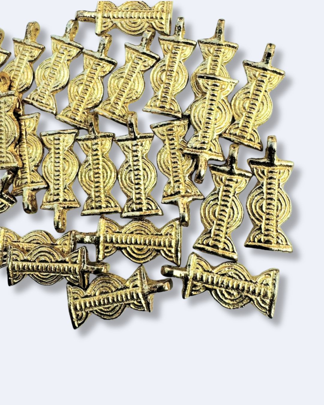 This fish bone shaped brass charm features a detailed, symmetrical design with engraved textures and a warm gold-tone finish. The stylized form gives it an artisanal, slightly tribal look, making it a standout accent in handmade jewelry and creative designs.