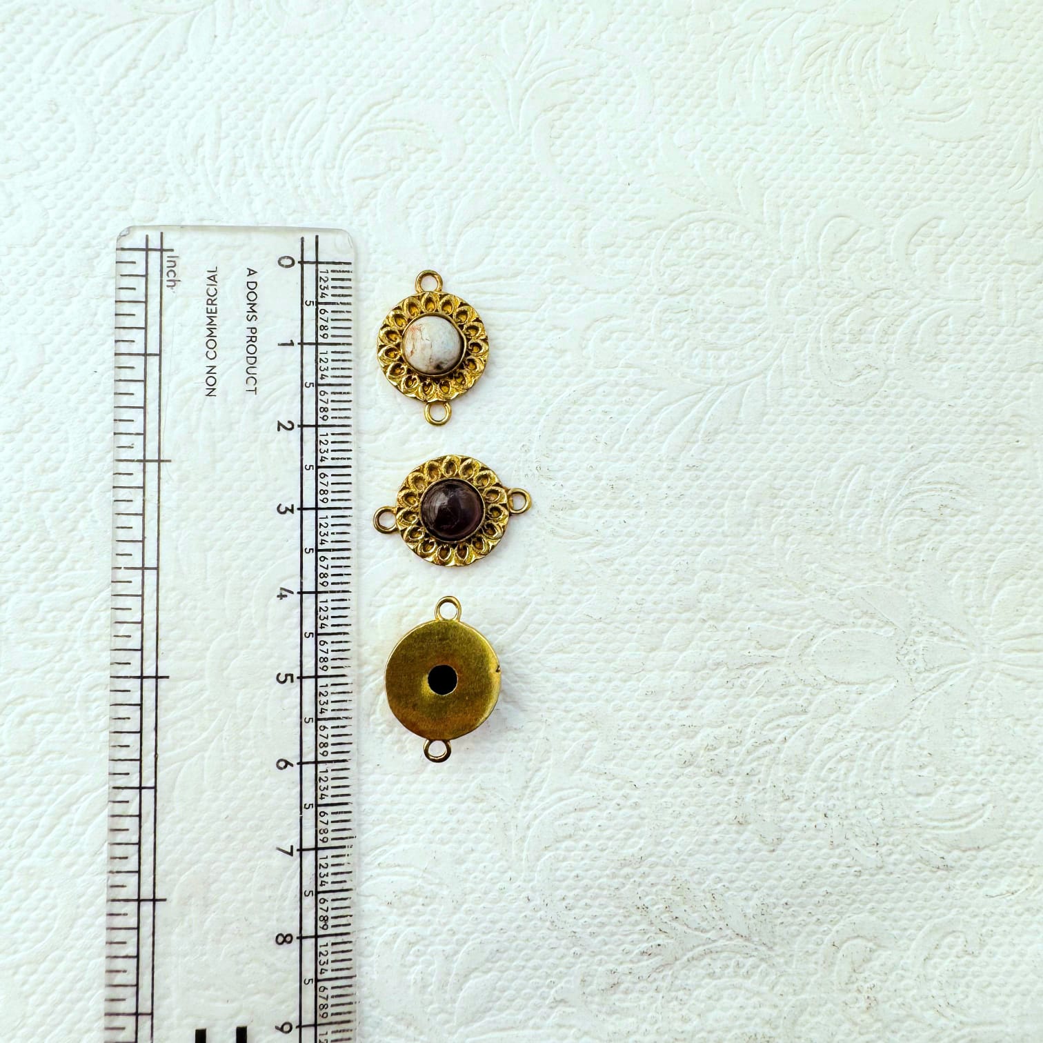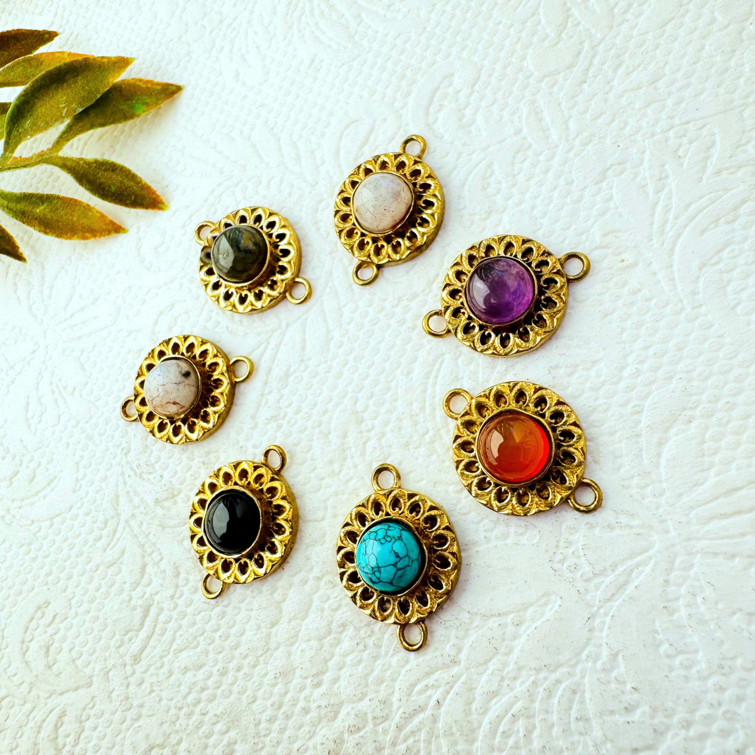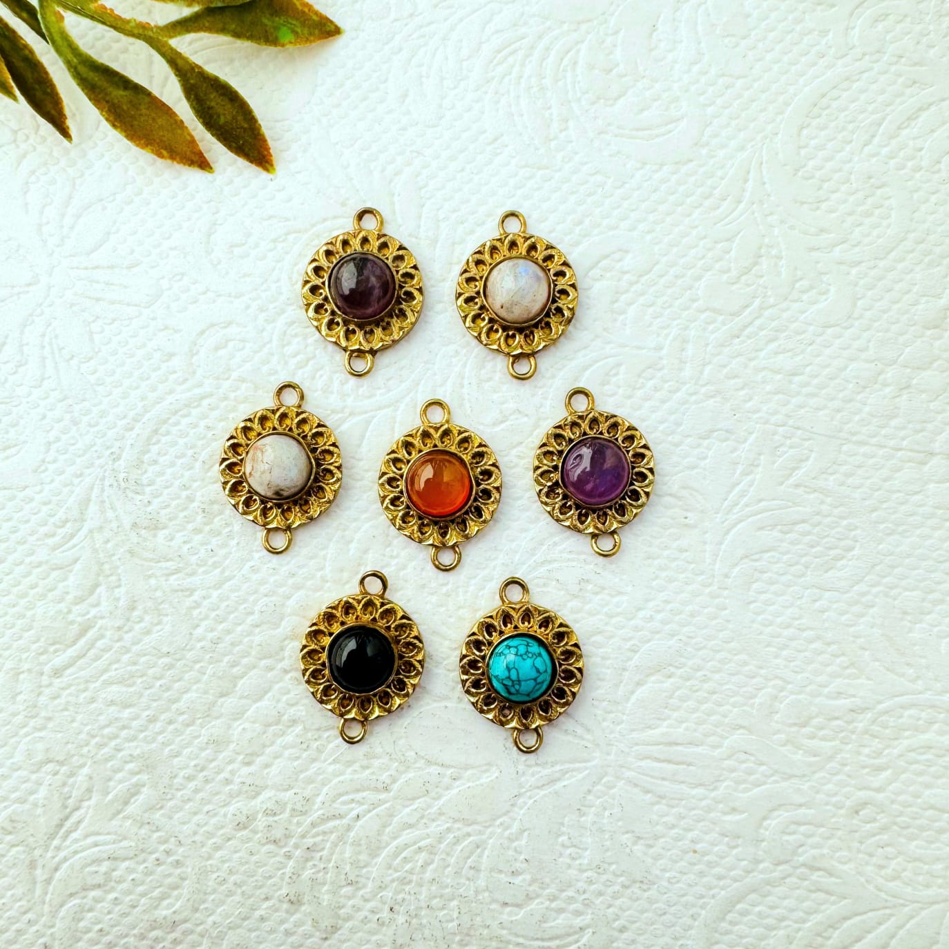 Beautiful round brass connector charms featuring assorted natural gemstone cabochons. Each charm displays intricate filigree detailing with a two-loop design for easy linking in bracelets, necklaces, and earrings.
