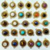 This mixed collection of brass gemstone connector charms includes an assortment of natural cabochons such as turquoise, tiger’s eye, amethyst, black onyx, lapis, and green aventurine, each elegantly framed in an ornate round filigree brass bezel. The warm golden tone of the brass complements the varied colors and textures of the stones, creating a striking and versatile component for jewelry making.