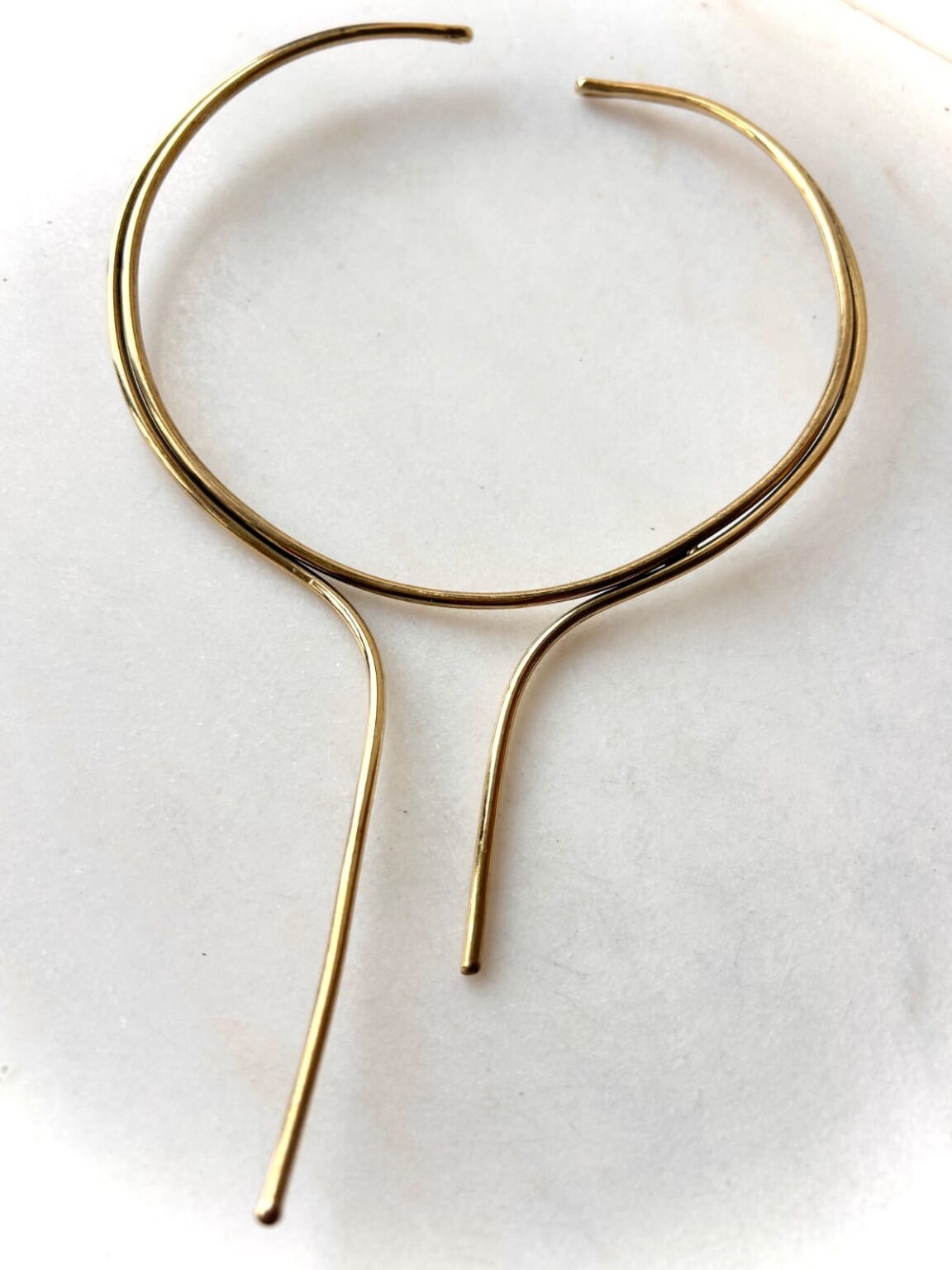 A refined double wire brass choker with elegant elongated drop ends. Designed to make a strong statement while remaining comfortable and wearable.