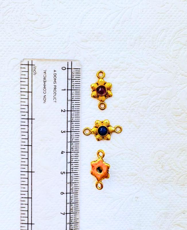 Set of small handcrafted brass connectors shaped like delicate six-petal flowers, featuring a gemstone cabochon at the center and double side loops for easy attachment in micro-macramé or jewelry projects.