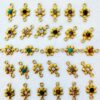 Set of small handcrafted brass connectors shaped like delicate six-petal flowers, featuring a gemstone cabochon at the center and double side loops for easy attachment in micro-macramé or jewelry projects.