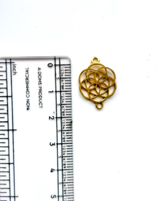 This intricate charm features a sacred geometry-inspired pattern composed of overlapping circular petals. With loops at the top and bottom, it functions perfectly as a vertical connector for jewelry or textile work.