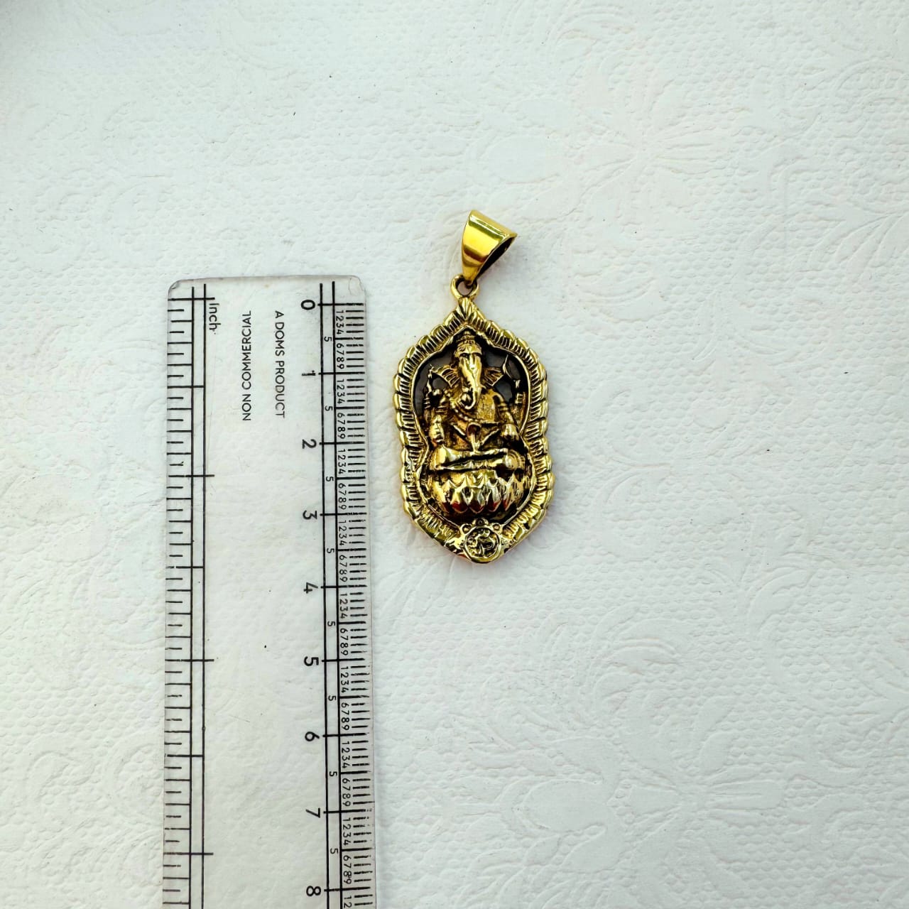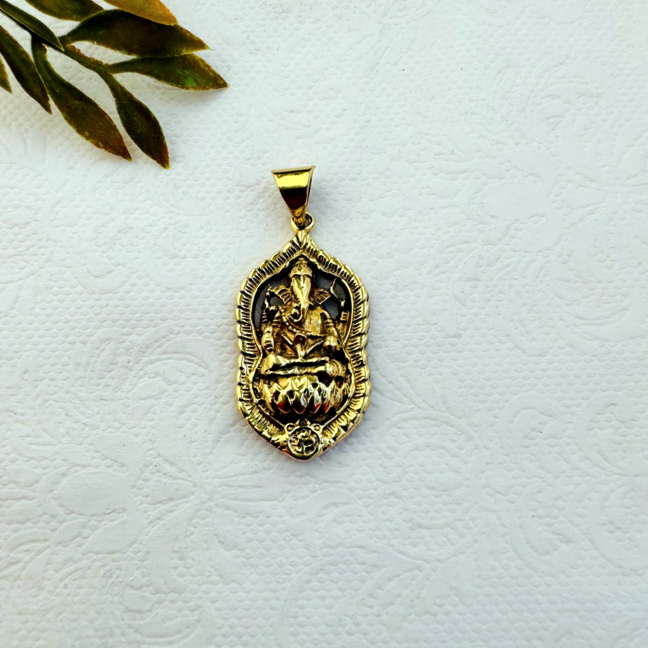 This striking brass pendant showcases a finely detailed depiction of Ganesha, the revered Hindu deity symbolizing wisdom, prosperity, and the removal of obstacles. The figure is framed within an ornate, shield-like border that enhances the depth and presence of the design, giving the pendant a strong spiritual and artistic character.