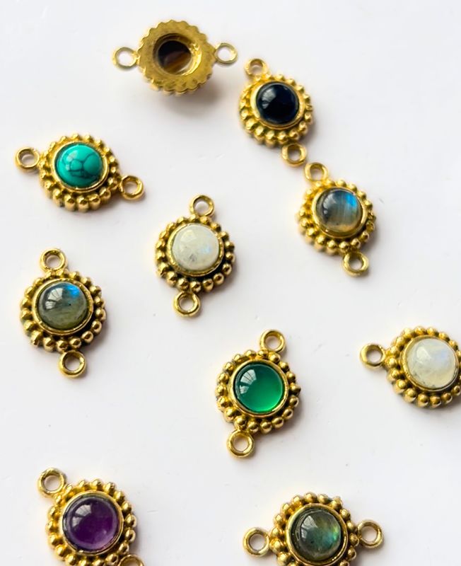 Brass stone connectors featuring round cabochons framed in detailed dotted bezels, ideal for handmade jewelry and crafts.