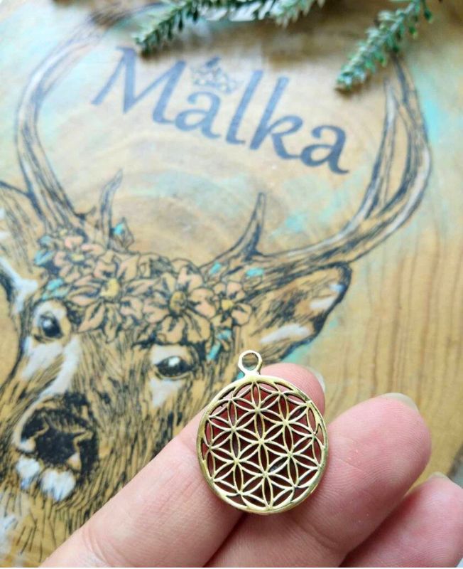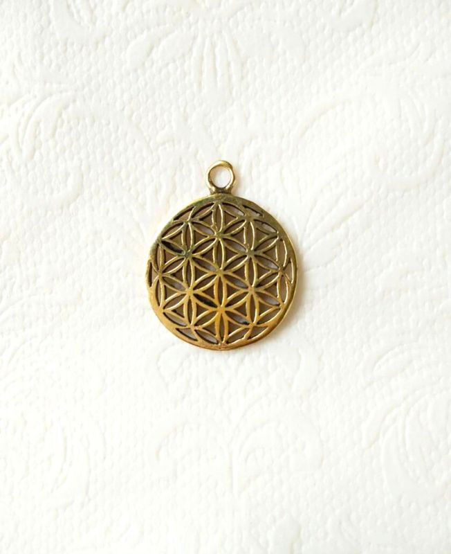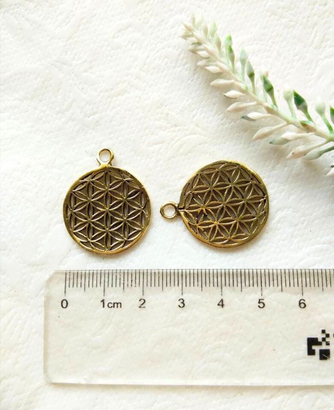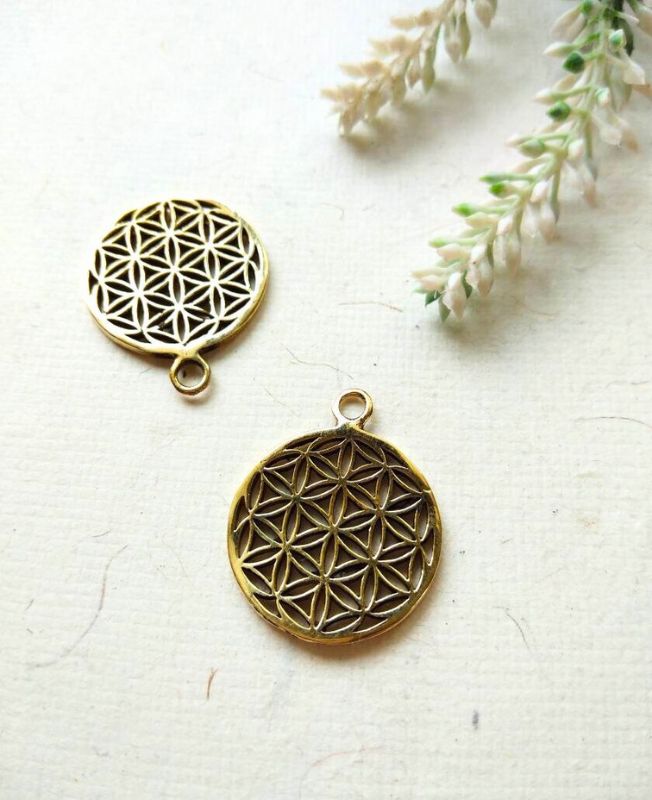 A delicately crafted brass pendant showcasing the sacred Flower of Life pattern. Ideal for spiritual jewelry, healing art, or meaningful macrame accents