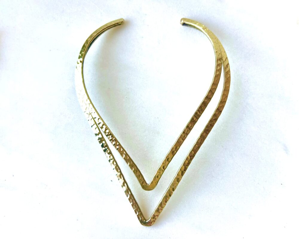 A bold yet elegant layered brass choker featuring a sculptural V shape design with a hand hammered texture. Designed to make a strong statement while remaining comfortable and wearable.