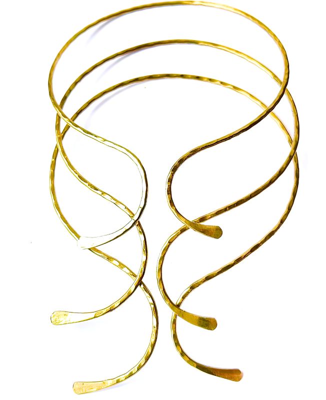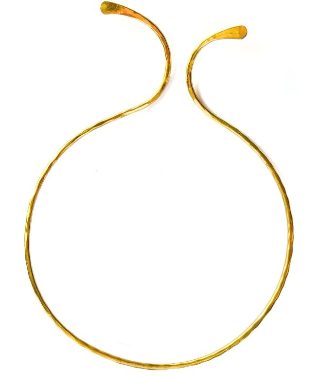 This open collar choker is expertly crafted from high-quality brass, featuring a subtle hammered texture that adds depth and character. The slightly irregular surface reflects light beautifully, making it a striking statement piece.