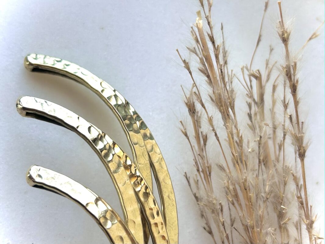 This handcrafted brass choker is composed of layered V-shaped bands that create a striking geometric silhouette. Each layer is finished with a hand-hammered texture, adding depth, character, and a soft organic shine to the raw brass surface.