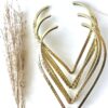 This handcrafted brass choker is composed of layered V-shaped bands that create a striking geometric silhouette. Each layer is finished with a hand-hammered texture, adding depth, character, and a soft organic shine to the raw brass surface.