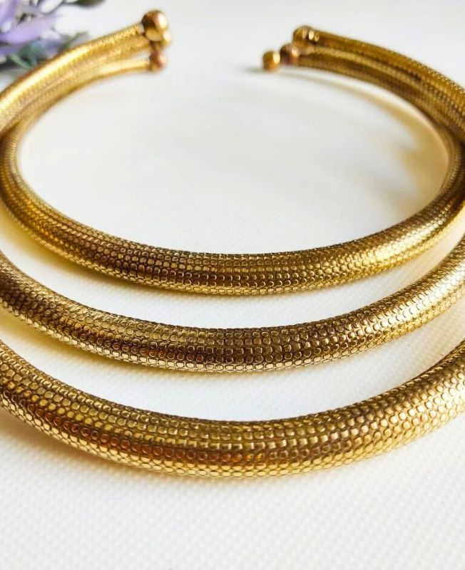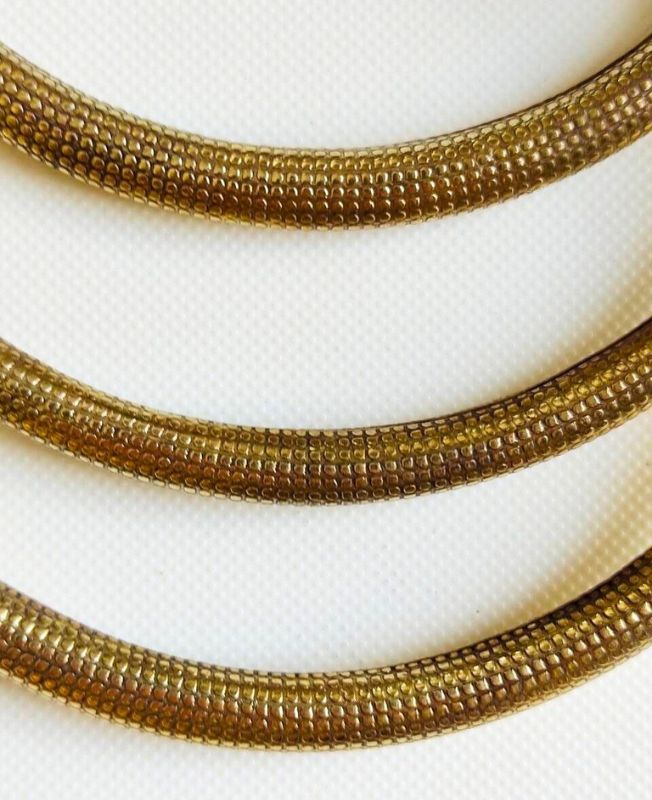 This eye-catching choker set includes three handcrafted brass pieces, each featuring a refined honeycomb-style texture that gives a tactile and dimensional finish. The repeated circular pattern across the surface reflects light beautifully and adds richness to the overall look. Smooth rounded ends ensure a comfortable and secure fit.