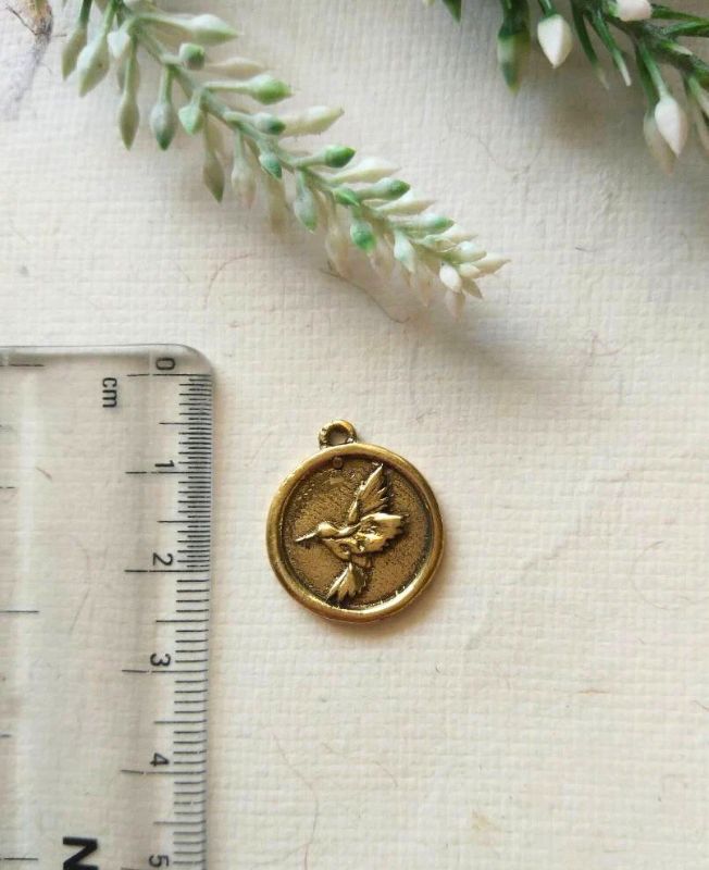 This vintage-style brass medallion features a delicately embossed hummingbird in mid-flight, symbolizing joy, lightness, and resilience. The soft textured background creates depth, while the raised bird design adds a tactile and visual focal point. Its compact round shape makes it ideal for everyday wear or symbolic handmade pieces.