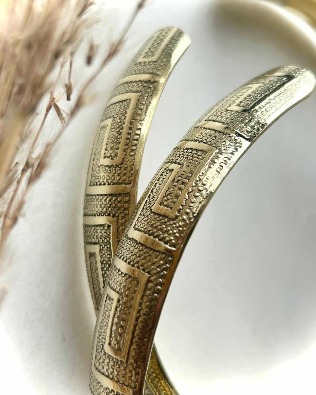 The Labyrinth Edge Brass Choker is defined by its powerful geometric engraving, inspired by ancient maze motifs and architectural symmetry. The surface combines raised linear forms with finely textured dotted fields, creating a rich contrast of depth and structure.