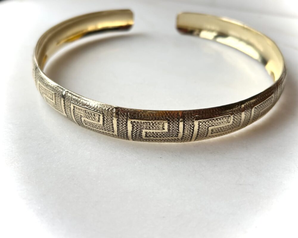 A bold brass choker featuring a raised geometric maze pattern. Designed to make a strong statement while remaining comfortable and wearable.