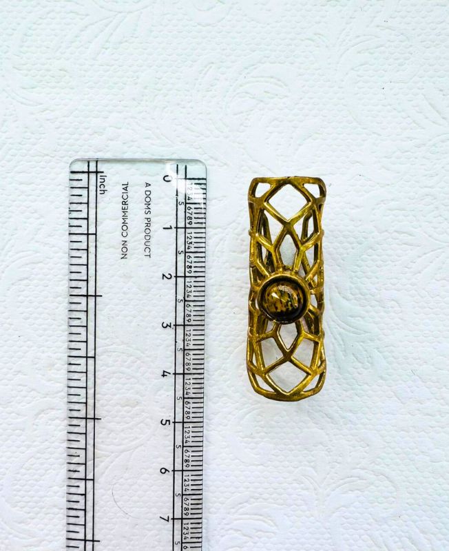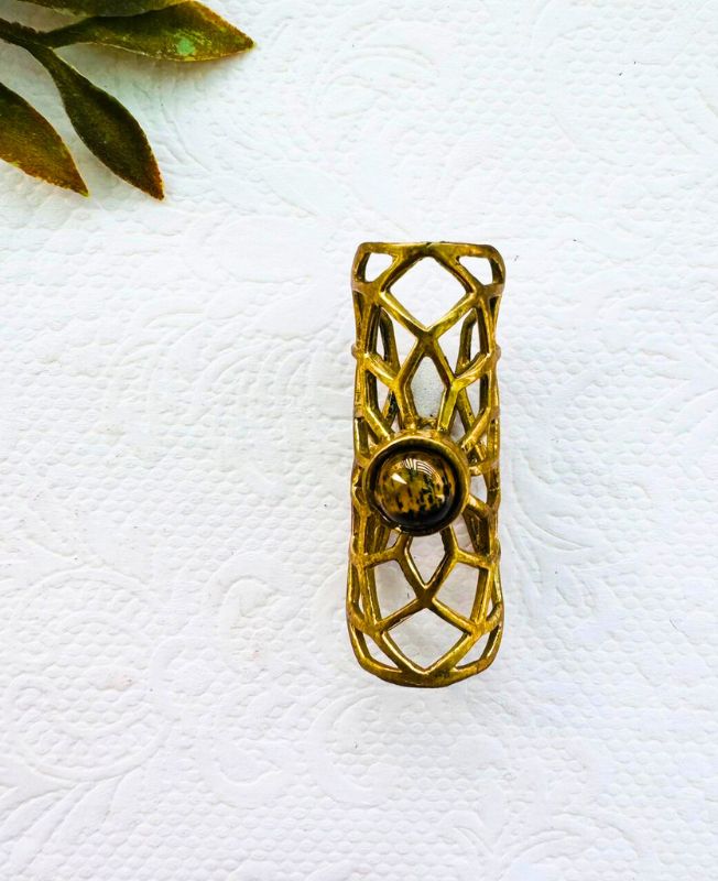 Adorn your hair with this captivating brass dreadlock bead that masterfully blends geometric precision with natural beauty. The cuff is intricately crafted with an openwork lattice pattern, creating a striking visual texture that’s both modern and timeless. At its core, a smooth, round stone with earthy tones (possibly tiger’s eye or a similar natural stone) is inlaid, adding a grounding and sophisticated element to the design.