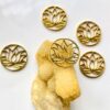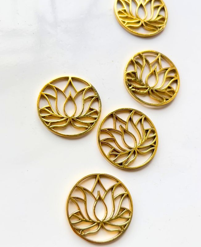 Gold-tone circular charm featuring an openwork lotus flower design, ideal for spiritual or bohemian-inspired crafts and jewelry