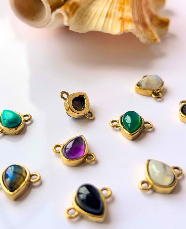 High-shine teardrop brass stone connectors in a variety of rich colors, designed to elevate your jewelry pieces with elegance and versatility.
