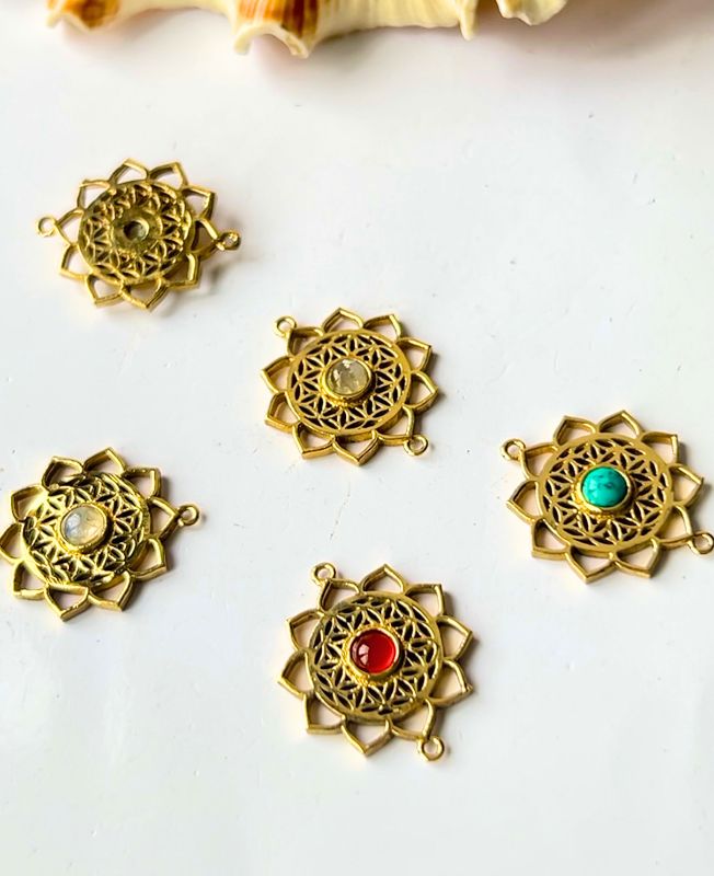 Brass stone connectors with intricate mandala-inspired floral frames and vibrant gemstone centers, perfect for meaningful and decorative jewelry.