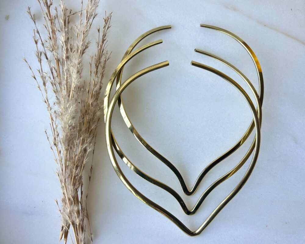 A sleek, sculptural brass choker with a soft V shaped curve and smooth polished finish. Designed to make a strong statement while remaining comfortable and wearable.