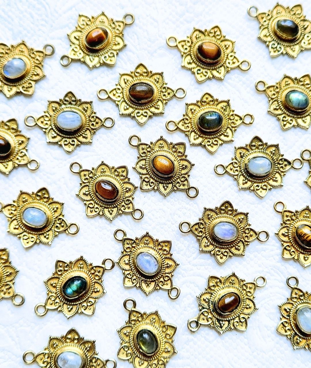 Add a touch of elegance and earthy charm to your creations with our Mandala gemstone brass charms. These premium connectors are made with an antique gold-tone brass alloy base and feature a polished gemstone cabochon at the center. Each piece is meticulously crafted, making it perfect for jewelry making, macrame art, and other creative projects.
