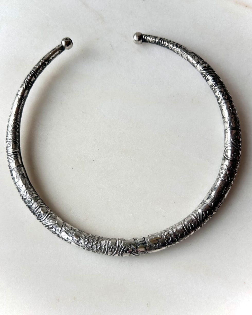 The Moon Grain Silver Tone Brass Choker is defined by its rich, tactile surface an all over dotted texture that catches light softly, creating a quiet rhythm across the metal. The pattern feels organic and grounding, reminiscent of lunar surfaces or fine metal granulation, giving the piece a strong visual presence without overpowering the look.
