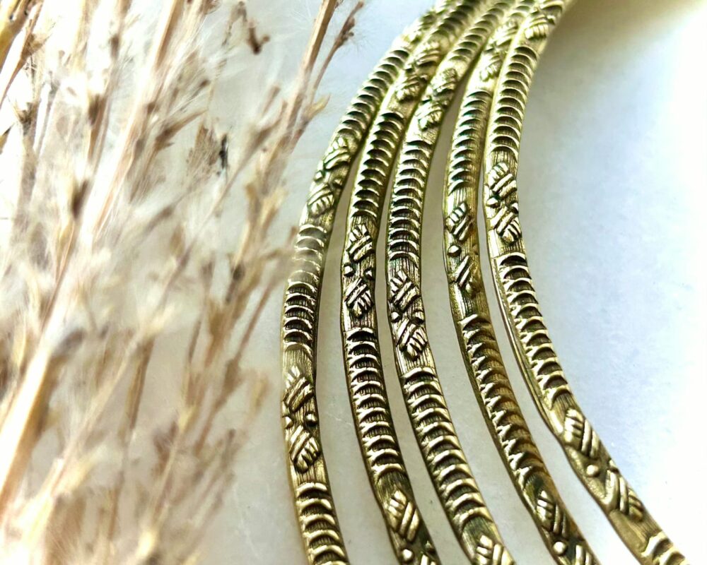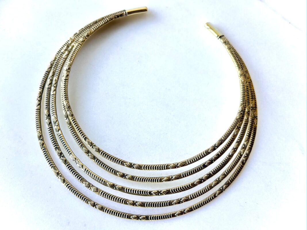 This handcrafted brass choker is composed of multiple rounded bands layered together to create a full, dimensional silhouette. Each band is detailed with fine engraved patterns, adding rhythm, texture, and a handcrafted character that catches the light beautifully.