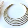 This handcrafted brass choker is composed of multiple rounded bands layered together to create a full, dimensional silhouette. Each band is detailed with fine engraved patterns, adding rhythm, texture, and a handcrafted character that catches the light beautifully.