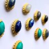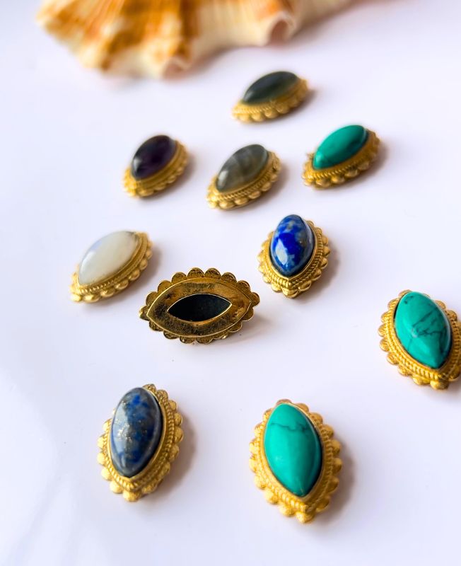 This beautiful oval Shape Grooved Stones collection features a natural marquise cut gemstone and brass grooved frame around and showcases a perfect blend of traditional craftsmanship and contemporary design. The warm golden brass complements the vibrant tones of the stones, giving them a luxurious, timeless look. Made by hand for micro macrame jewelry and other jewelry making .Each piece is made from high-quality brass with an ornate beaded and grooved bezel that enhances the natural beauty of the stone it holds.