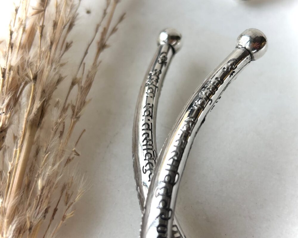 This silver-tone brass choker features a smooth, rounded silhouette adorned with finely engraved sacred script inspired by ancient Sanskrit mantras. The continuous text wraps gracefully around the neck, creating a powerful yet understated statement piece that carries both visual rhythm and symbolic meaning. Designed as an open choker with softly rounded ball ends, it offers comfortable wear and gentle flexibility, adapting naturally to the neckline. The polished surface enhances the engraved lettering, allowing light to reflect subtly while keeping the overall look refined and timeless.