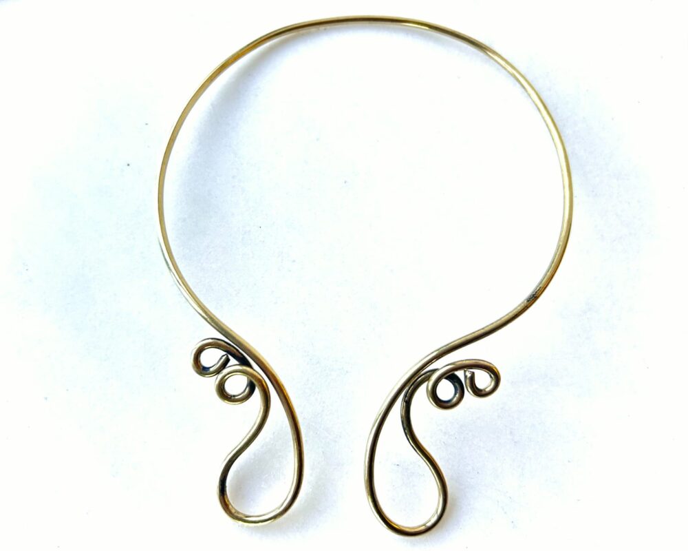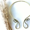 A clean, sculptural brass choker crafted from a single round wire and finished with elegant spiral hook ends. Designed to make a strong statement while remaining comfortable and wearable.