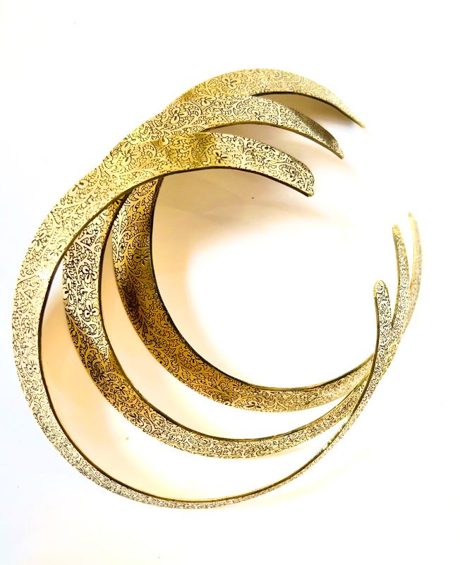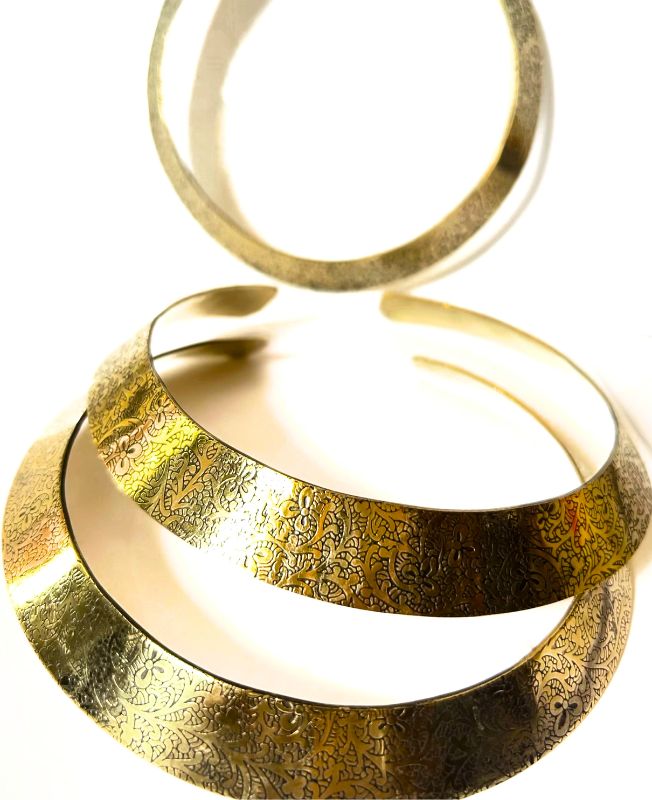 A set of three richly wide brass collar choker featuring intricate floral engravings, perfect for adding a touch of vintage elegance.