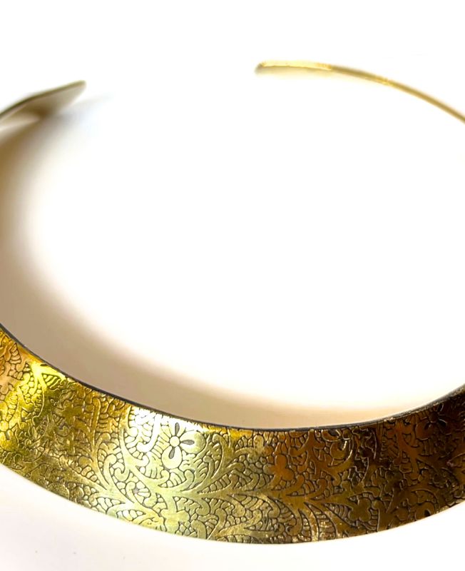 This statement brass collar choker showcases a beautifully detailed floral engraving inspired by traditional patterns. The ornate design catches the light with every movement, making it a standout accessory for special occasions or artistic styling.
