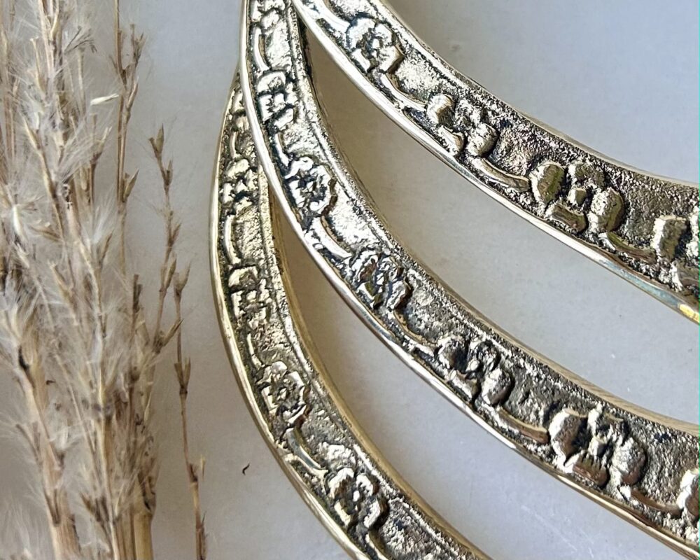 This layered engraved V-shape brass choker is designed to make a statement. Formed from multiple solid brass layers, each band is finished with a raised tribal-inspired pattern that adds depth, texture, and an artisanal feel. The sharp V-shape creates a strong geometric silhouette that naturally frames the neckline, making it perfect as a standalone piece or as a bold base for added elements.