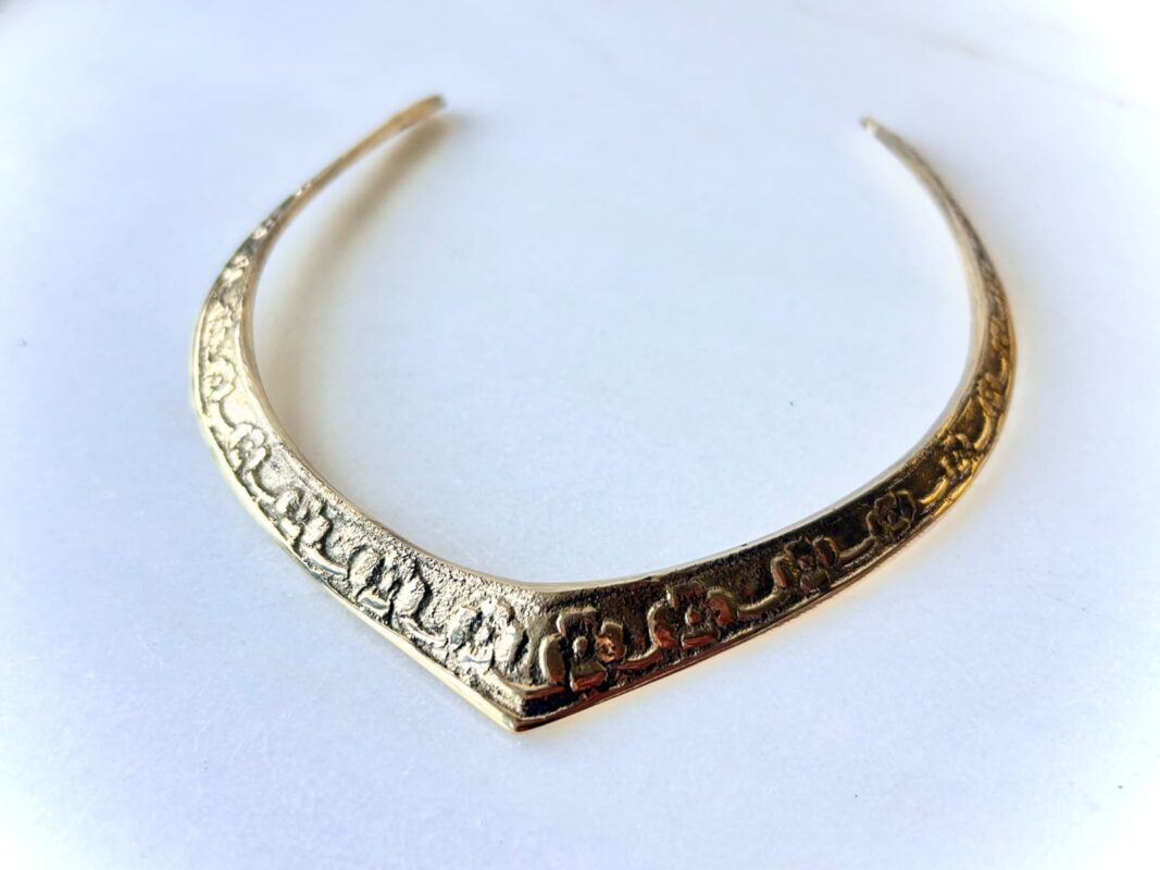 Statement layered brass choker featuring a bold V shape silhouette and raised tribal-inspired engraving. Designed to make a strong statement while remaining comfortable and wearable.