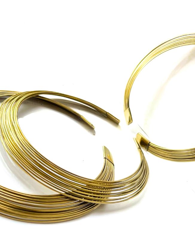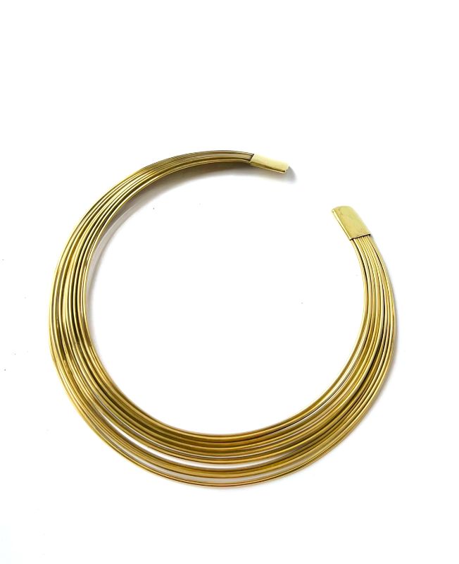 This stunning multi-layer brass choker features a series of evenly curved, polished brass wires arranged in a layered collar style. Designed for a bold and contemporary look, this piece combines structural elegance with timeless metallic shine.