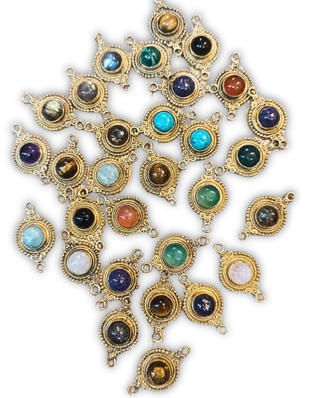 Add a touch of elegance and earthy charm to your creations with our Mandala gemstone brass charms. These premium connectors are made with an antique gold-tone brass alloy base and feature a polished gemstone cabochon at the center. Each piece is meticulously crafted, making it perfect for jewelry making, macrame art, and other creative projects.