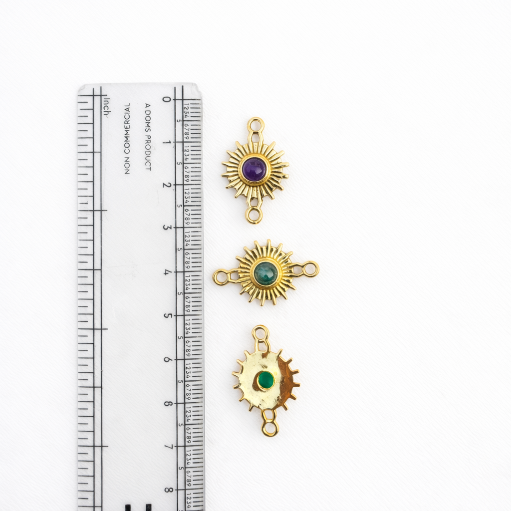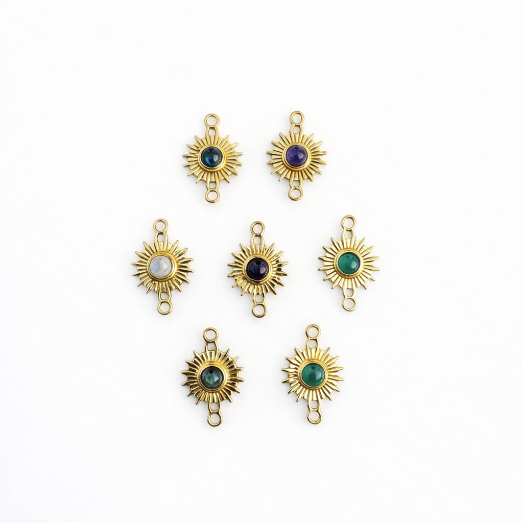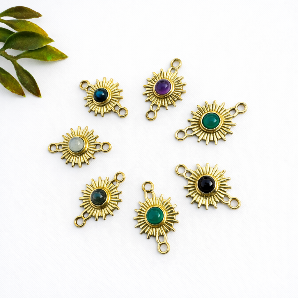 A vibrant collection of handcrafted brass sunburst stone shaped charms featuring assorted natural gemstones. Each piece showcases a mini double loop connector design ideal for macramé, beaded jewelry, and layered creations.