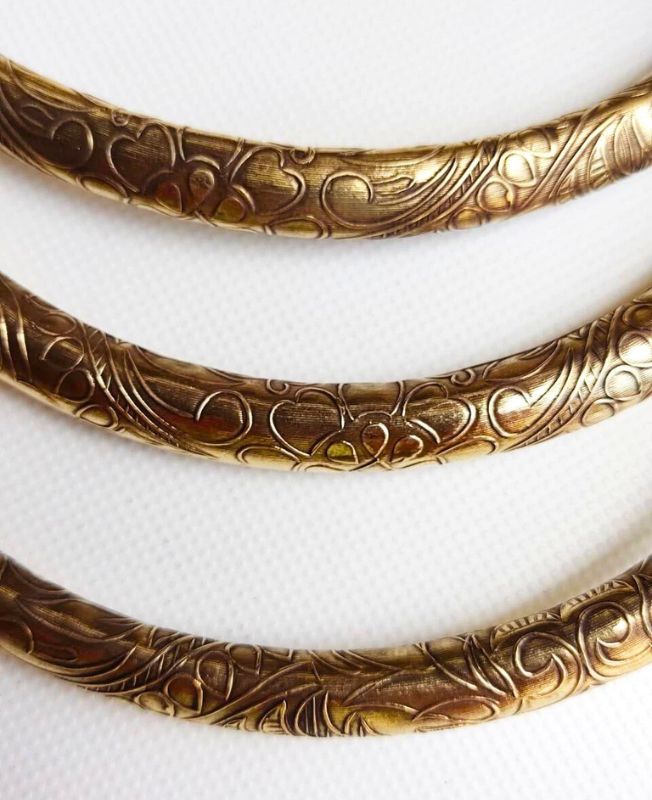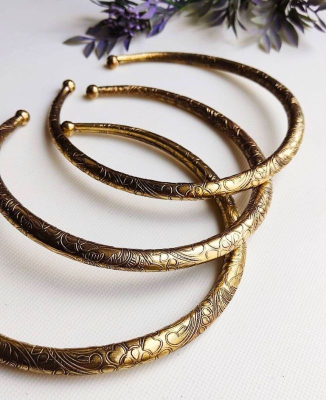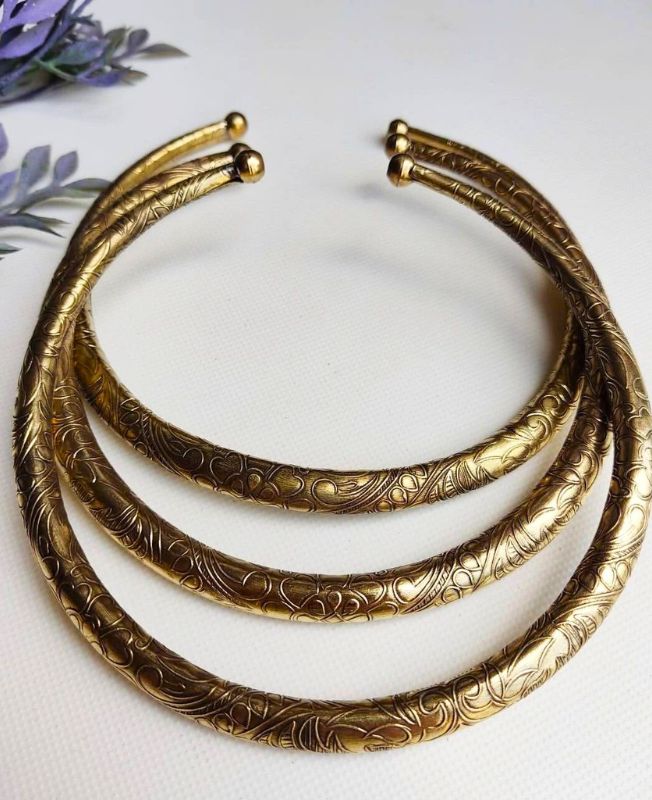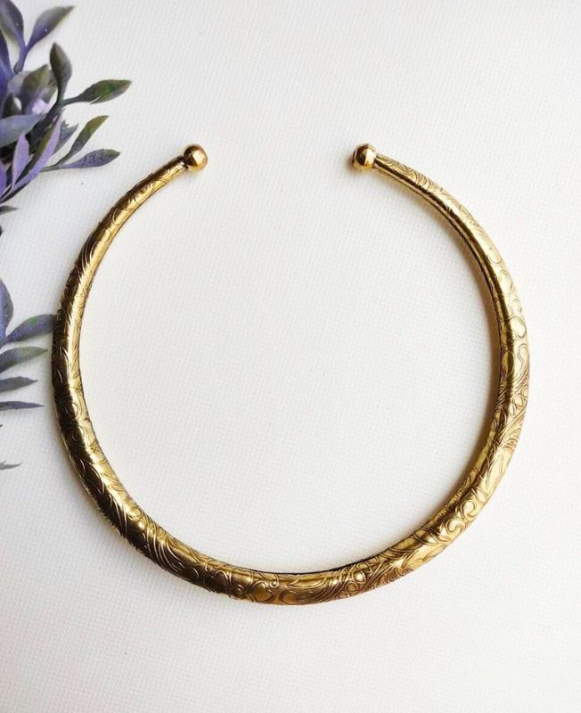 This beautifully crafted choker set includes three solid brass pieces, each engraved with flowing swirl patterns that echo natural movement and elegance. The designs are soft yet intricate, creating a refined texture across the curved surface of each choker. Finished with polished ball ends, they offer a seamless blend of comfort and structure.