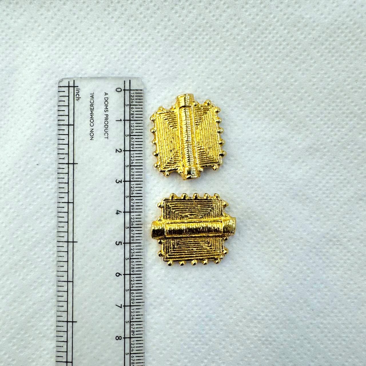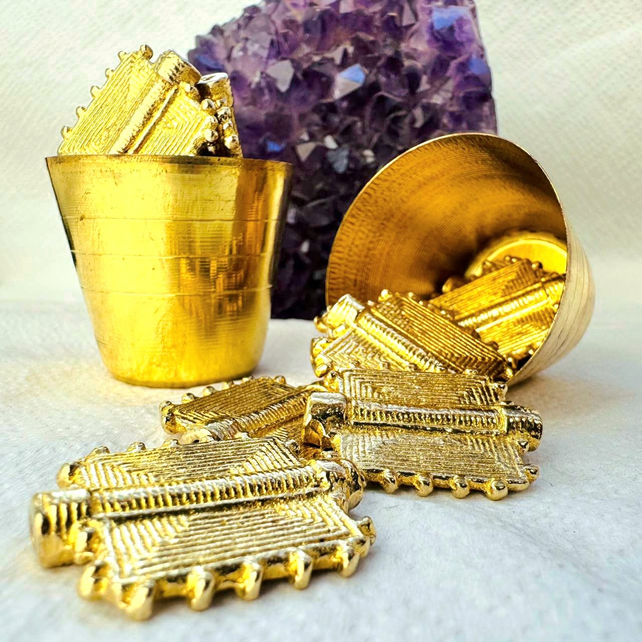 These brass charms feature a rectangular shape with detailed linear engraving and a raised central bar, framed by a subtle dotted edge. Finished in a warm gold tone, the design has a strong ethnic and tribal character, making it an excellent focal piece for statement jewelry.