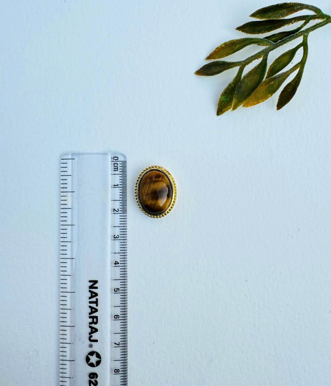 This oval tiger eye groove stone features a polished cabochon with rich golden-brown tones and natural chatoyancy, framed by a finely detailed brass bezel with a subtle grooved edge. The warm brass finish enhances the depth and movement of the tiger eye, creating a striking yet balanced focal element.