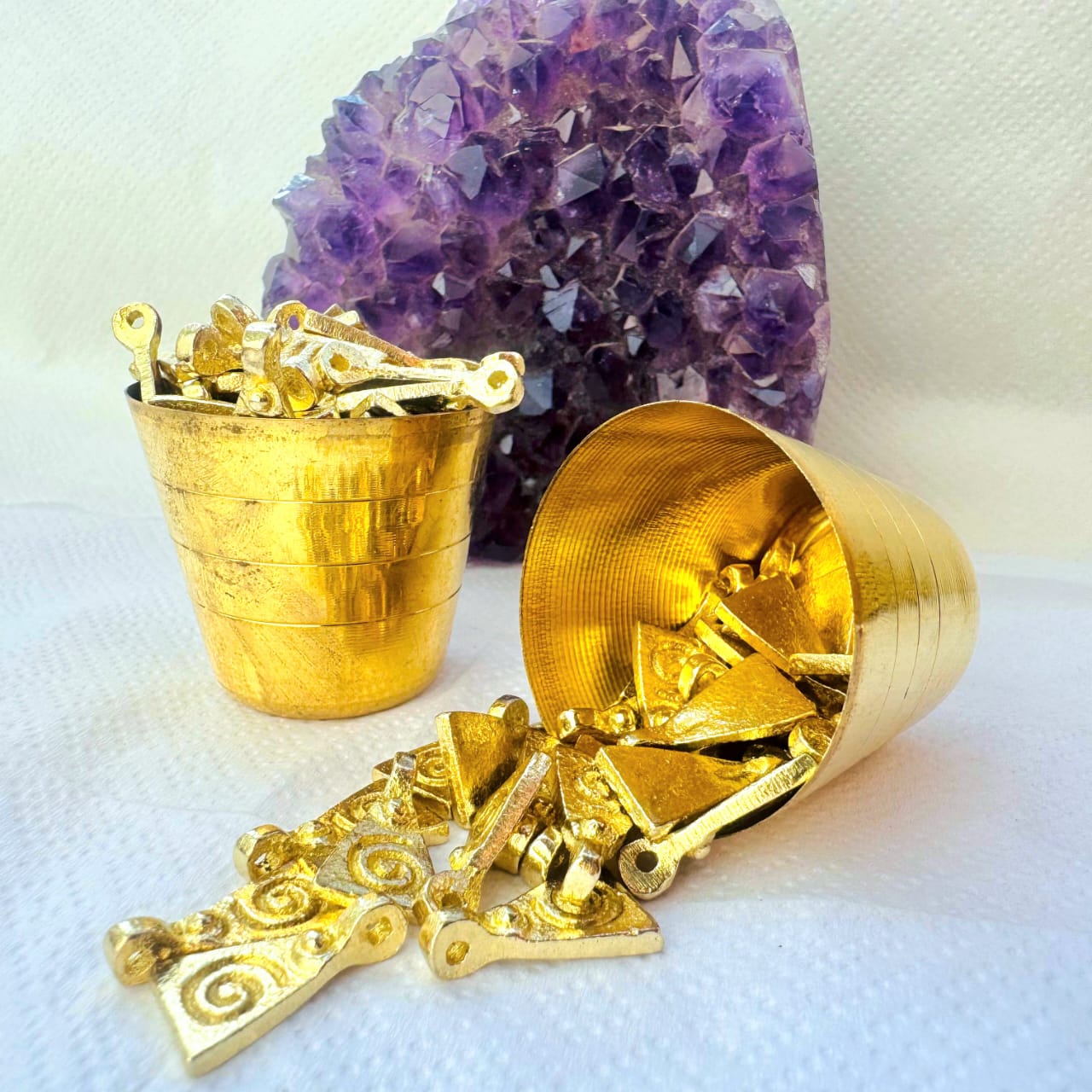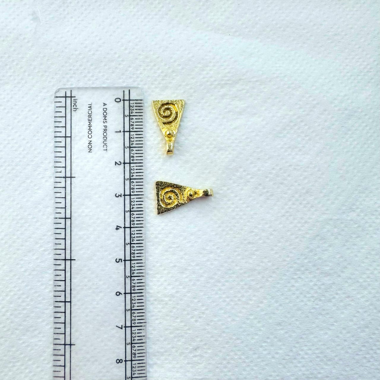 These small tribal inspired brass charms feature a beautiful engraved spiral design on a triangular base, finished with a warm gold tone. Their compact size and lightweight feel make them ideal for detailed jewellery work, including earrings, necklaces, bracelets, and macramé creations..