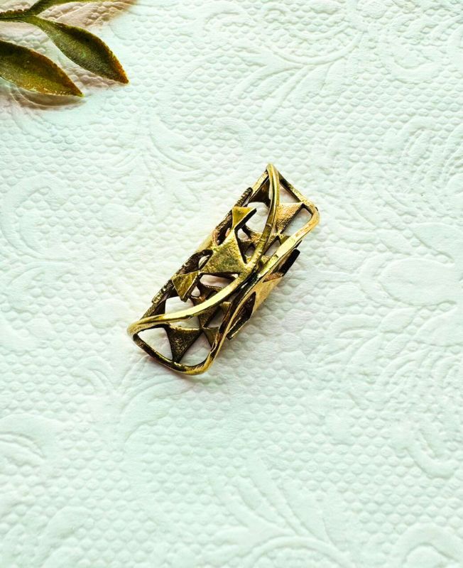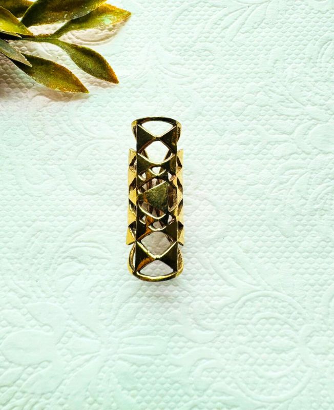 Make a striking statement with this geometrically complex brass dreadlock cuff. The design is built upon a continuous system of interlocking triangles and diamond shapes that wrap around the circumference of the cuff. This precise, structured pattern gives the piece an architectural quality, offering a bold yet refined look. The openwork construction ensures the cuff is lightweight and comfortable for all-day wear.