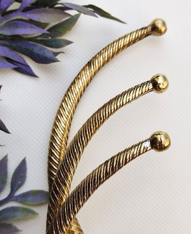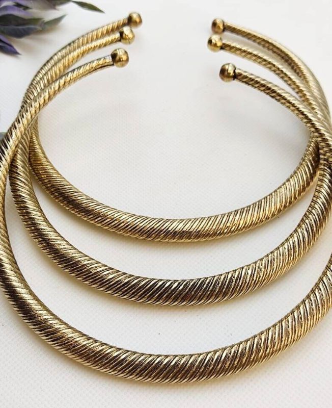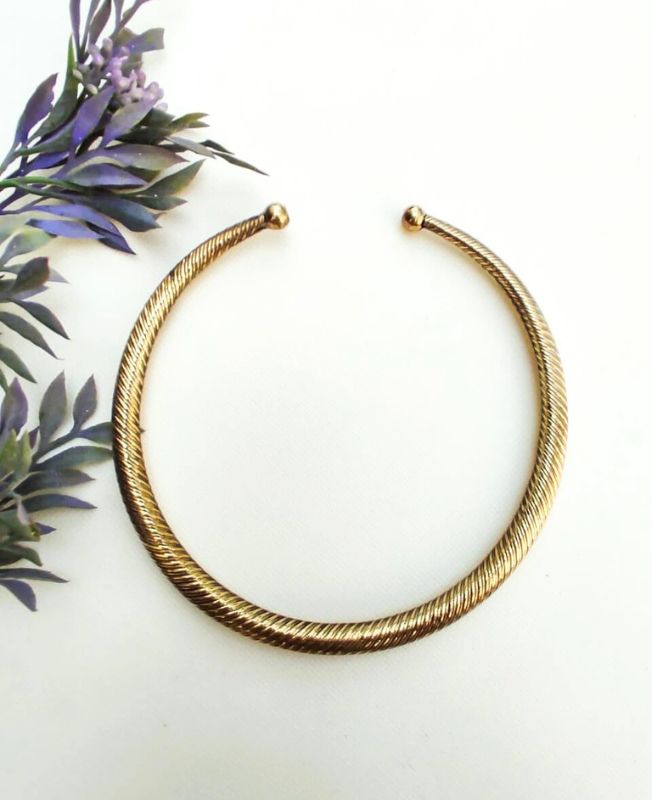 This striking choker set features three handcrafted brass pieces, each designed with a detailed twisted rope texture that gives the set a bold, sculptural presence. The diagonal pattern wraps around each band with precision, creating movement and dimension that catches the light from every angle. Finished with smooth ball ends, they sit comfortably at the neck.